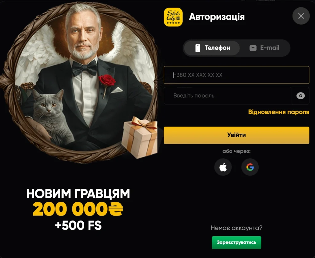 Вхід у Slots City здійснюється в один клік. Найчастіше використовується логін та пароль, створені при реєстрації. Додатково можна авторизуватися за допомогою SMS-підтвердження через номер телефону.